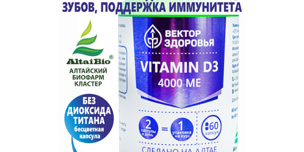 Комплекс Витамин Д3 4000 МЕ, Вектор Здоровья, капсулы, 60 штВитамин Д3 4000 МЕ - биодоступная и эффективная форма витамина D, стимулирующая укрепление иммунитета и поддерживающая сердечно-сосудистую, нервную, репродуктивную системы. Участвует в регуляции обмена кальция и фосфора в организме. Витамин Д3 помогает нормализовать свертываемость крови, улучшает чувствительность клеток к инсулину и усвоение углеводов, активирует регенерацию нервных волокон и повышает их чувствительность, препятствует отложению холестерина на стенках сосудов.
